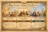 📜 Falsafah, sebagai usaha berdisiplin untuk mencari kebijaksanaan, telah berkembang selama berabad-abad merentasi perubahan tamadun, budaya, dan cabaran intelektual. Walaupun sejarahnya kaya dan kompleks, ia lazimnya dibahagikan kepada tiga fasa utama: Falsafah Kuno, Falsafah Zaman Pertengahan, dan Falsafah Moden. Setiap fasa mencerminkan cara yang tersendiri dalam memahami realiti, pengetahuan, dan kewujudan manusia.